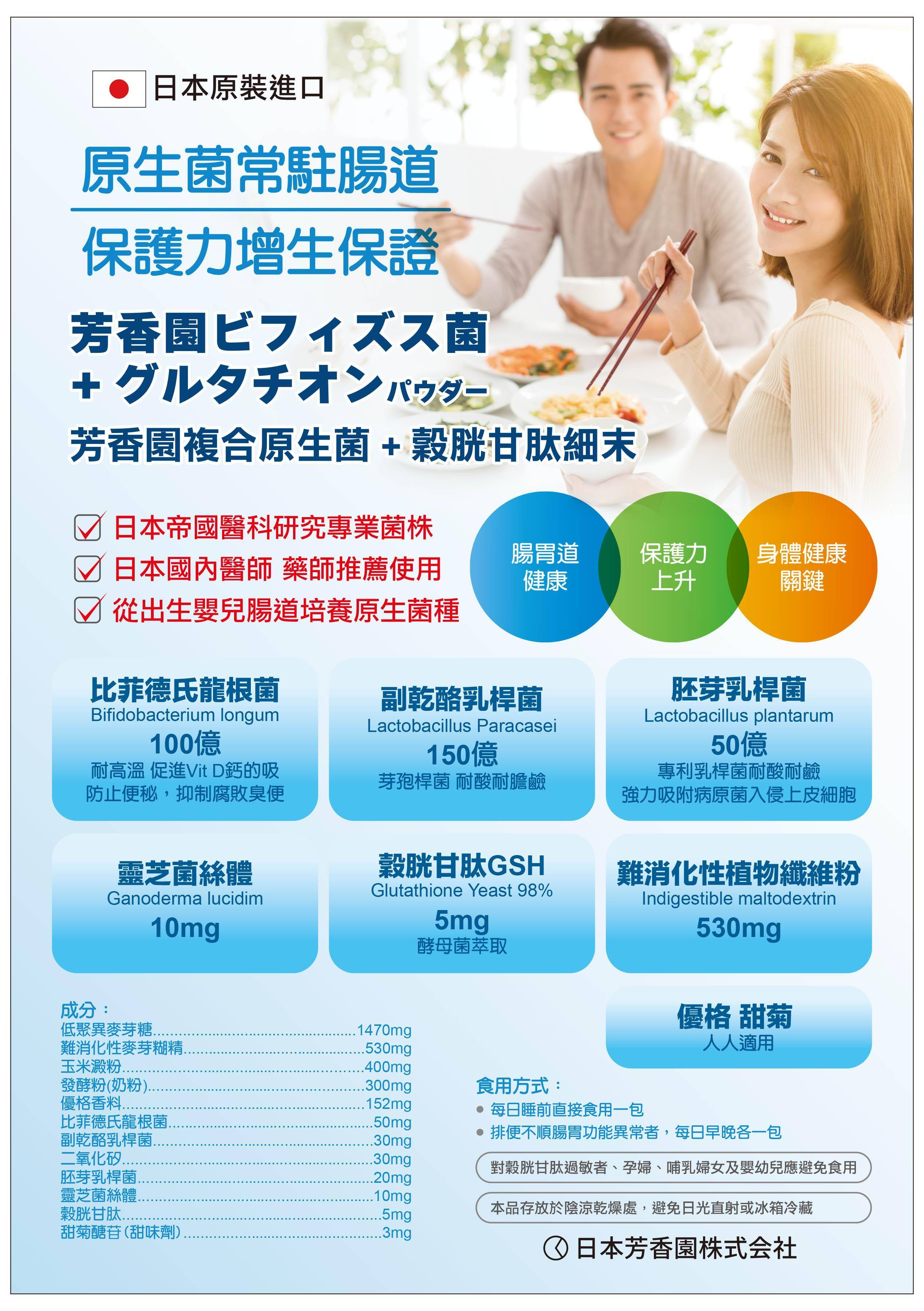 成分:低聚麥芽糖、難消化性麥芽糊精、玉米澱粉、發酵粉(奶粉)、優格香料、比菲德氏龍根菌、副乾酪乳桿菌、二氧化矽、胚芽乳酸菌、靈芝菌絲體、穀胱甘肽、甜菊醣苷(甜味劑)